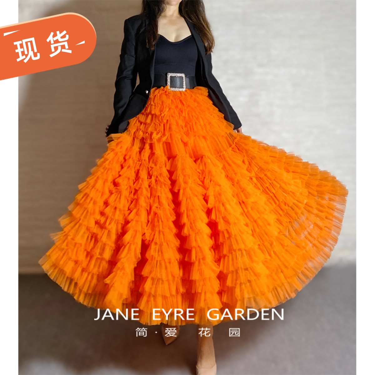 简爱花园◆设计感黄色印花半身裙中长款蓬蓬塔裙A字大摆纱裙JA276