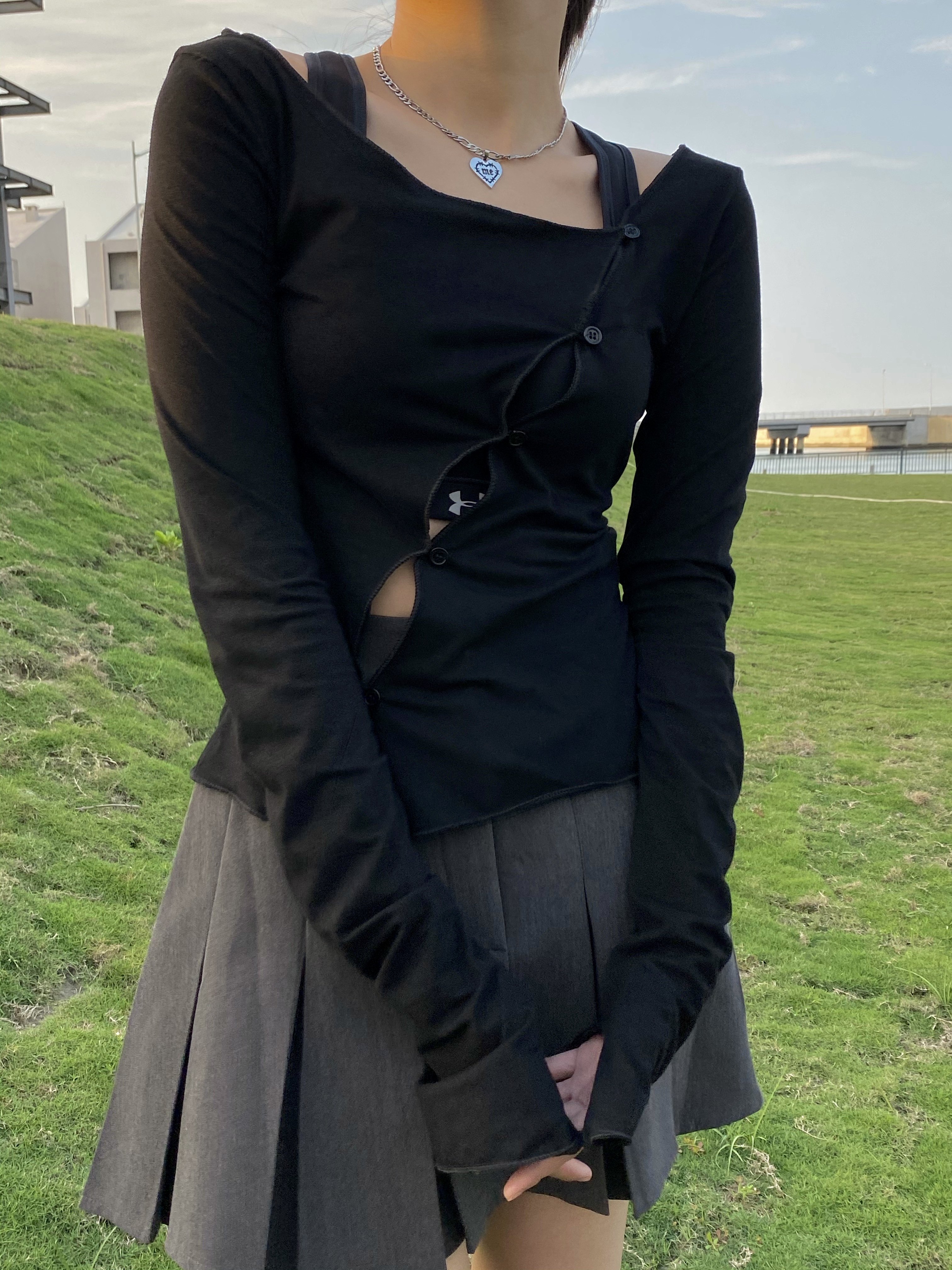 【有名商店】韩系ins原创设计修身长袖镂空斜扣开衩黑开衫上衣女热门设计联盟服务商